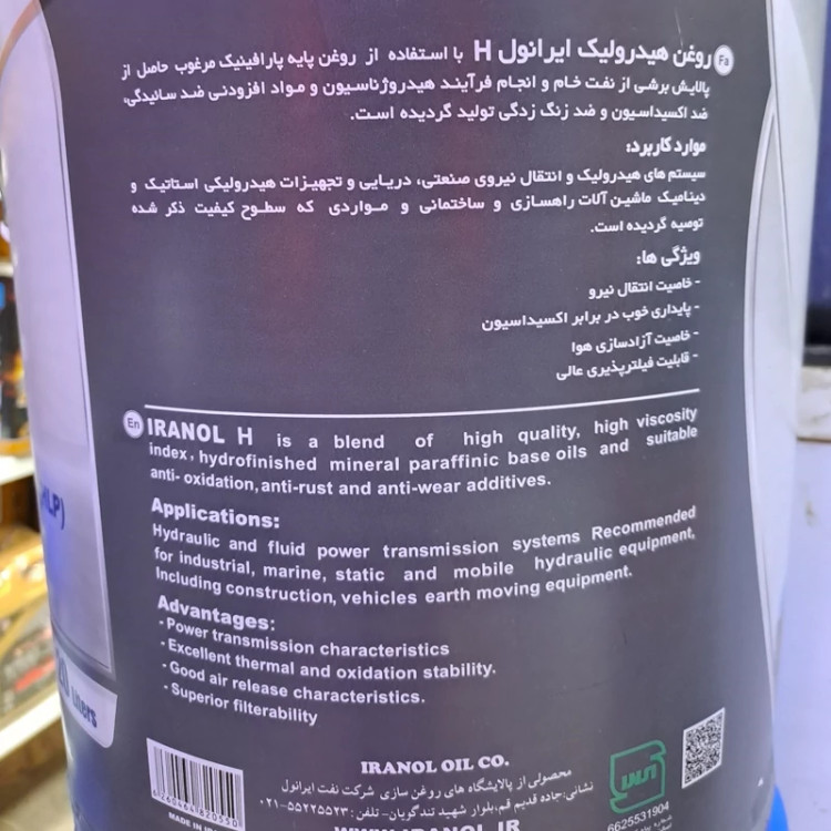 ایرانول H با استفاده از روغن پايهی پارافینیک مرغوب حاصل از پالايش برشی از نفت خام و انجام فرآيند پالایش با هیدروژن (Hydro finishing) و مواد افزودني ضد اکسیداسیون و ضد زنگزدگی، توليد گرديدهاست. موارد کاربرد .سیستمهای هیدرولیک و انتقال نیروی صنعتی، دریایی و تجهیزات هیدرولیکی استاتیک و دینامیک ماشینآلات راهسازی و ساختمانی و در مواردی که سطوح کارآیی فوق توسط سازنده توصیه گردیدهاند. خصوصیات .خاصیت انتقال نیرو .جلوگیری از ساییدگی قطعات .پایداری خوب در برابر اکسیداسیون .خاصیت جداپذیری از آب .خاصیت آزاد سازی هوا .مقاومت در برابر تراکم پذیری .قابلیت فیلترپذیری عالی .محافظت در برابر خوردگی و زنگ زدگی