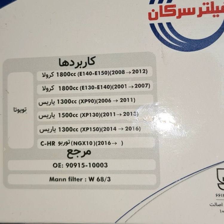فیلتر روغن سرکان (کد 7744) کرولا،یاریس،لیفان520،620،ایکس50،60جیلی ای سی 7 تویوتا - TOYOTA کرولا (E120 - E130) کرولا (E140 - E150) یاریس 1300CC (XP90) یاریس 1500CC (XP130) یاریس 1500CC (XP150)