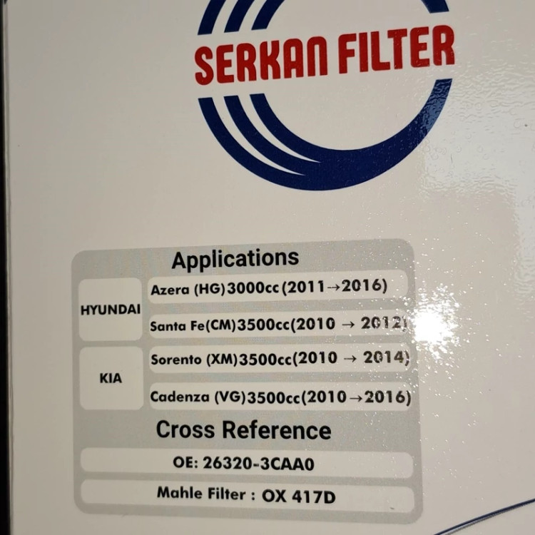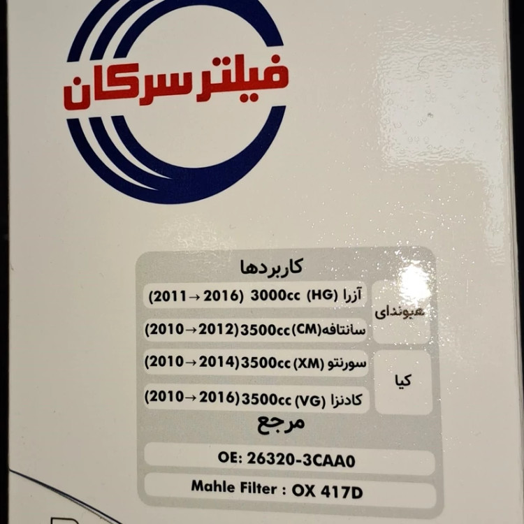هیوندا ازرا 3000 از 2011 تا 2016 سانتافه 3500 از 2010 تا 2012 سورنتو 3500 از 2010 تا 2014 کادنزا 3500 از 2010 تا 2016 ویژگیهای منحصربهفرد فیلتر روغن سرکان کیفیت بالا: تولید شده با استفاده از متریالهای مرغوب و مقاوم. سازگاری با انواع خودروها: فیلتر روغن سرکان برای خودروهای داخلی و خارجی (پژو، پراید، تیبا، نیسان و…) مناسب است. دوام و ماندگاری بالا: طراحی شده برای تحمل شرایط سخت کاری و عمر مفید طولانی. تصفیه دقیق روغن: جلوگیری از ورود ذرات کوچک به موتور و حفظ سلامت قطعات داخلی. مطابق با استانداردهای جهانی: رعایت استانداردهای ISO و کیفیت بالا در تولید. مزایای استفاده از فیلتر روغن سرکان کاهش هزینه تعمیرات: با جلوگیری از سایش قطعات داخلی موتور، هزینههای نگهداری خودرو کاهش مییابد. افزایش طول عمر موتور: تصفیه بهتر روغن باعث افزایش طول عمر قطعات موتور میشود. عملکرد بهتر خودرو: تصفیه روغن موجب بهبود عملکرد موتور و کاهش مصرف سوخت میشود.