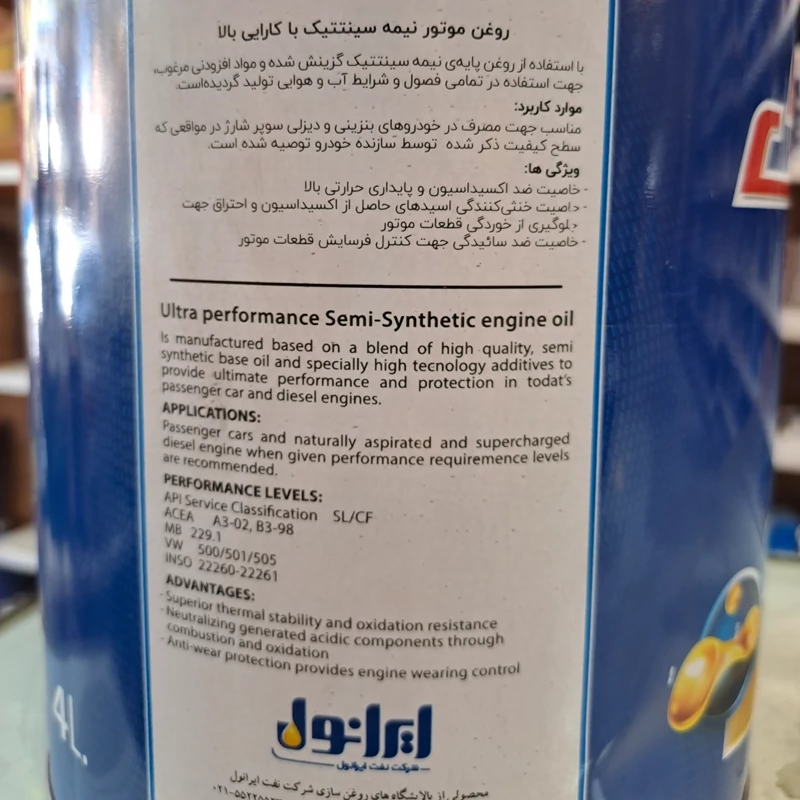 خصوصیات .پایداری حرارتی و مقاومت عالی در برابر اکسیداسیون .خاصیت پاککنندگی جهت کاهش رسوبات ناشی از احتراق و اکسیداسیون .خاصیت ضد سائیدگی جهت کنترل فرسایش قطعات موتور .خاصیت خنثیکنندگی اسیدهای حاصل از اکسیداسیون و احتراق جهت جلوگیری از خوردگی قطعات موتور .افزایش عالی طول عمر و قدرت موتور .خاصیت روانکاری مناسب در دماهای پایین بویژه در لحظه استارت زدن .حفظ گرانروی روغن در تمام طول مصرف مناسب برای خودروهای ... کیاموتور پیکانتو ، سراتو ، اپتیما ، سول ، موهاوی ، کارنیوال ، کارنز ایرانو خودرو دنا ، انواع خودرو های سمند پارس اتوماتیک TU5 ، پارس XU7 ، پژو 405 XU 7 رنو مگان ، تندر 90 ، پارس تندر هیوندای آوانته ، ورنا ، مزدا 3 فیات سی ینا ، برلیانس V5 سیتروئن C5 ، تویوتا کمری ، ام جی 550 چری MVM 315 , MVM X 33
