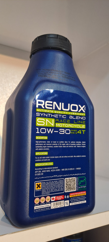 روغن موتور مسابقهای API:SN SAE: 10W-30 بستهبندی: 1 لیتر/4 لیتر روغن موتور مسابقهای Renuox (10W-30) (مخلوط سنتتیک)، بر اساس فناوری سنتتیک با راندمان بالا ساخته شده و به طور ویژه برای روانکاری بهینه برای موتورسیکلتها طراحی شده است. عملکرد بهینه، حداکثر محافظت از موتور در شرایط مختلف از ویژگیهای این روغن است. این روغن برای موتورهای چهار زمانه هواخنک و آبخنک با کلاچ تر یا خشک و همچنین برای شرایط فشار بالا و مسابقات مناسب است. مزایا: