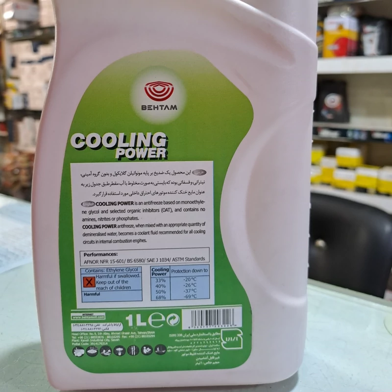 ضد یخ بهتام یک لیتری((((( قرمز)))))) محصول COOLING POWER یک ضدیخ/ضد جوش بر پایه مونو اتیلن گلایکول بوده که در تولید آن از مواد افزودنی آلی بازدارنده از خوردگی (OAT) استفاده شدهاست و هیچکدام از گروه های آمین، نیترات و فسفاتی در فرمولاسیون آنها وجود ندارد. این محصول، وقتی با مقدار مناسبی از آب دیونیزه یا مقطر مخلوط گردد، به یک مایع خنک کننده تبدیل شده که برای مصرف در مدار خنک کننده تمامی موتورهای احتراق داخلی در طول سال توصیه میشود. بعلاوه این ضدیخ پیشنهادی، بیشترین کیفیت را با حداقل هزینه نسبت به دیگر ضدیخ ها به مصرف کننده ارائه میدهد. به منظور دستیابی به یک مایع خنک کننده بهینه، توصیه میگردد تا به صورت مکانیکی آب را با ضد یخ/ ضدجوش مخلوط نمایید. نقاط قوت و مزایا: محصول COOLING POWER در تست های خوردگی (خوردگی صفحه داغ و ظروف شیشه ای) الزامات استاندارد را به خوبی پاس میکند. مایع خنک کننده ای که با رقیق کردن این محصول تهیه میشود، نسبت به آب بندها و الاستومرها خنثی میباشد (باعث خوردگی آنها نمیشود). مواد افزودنی موجود در محصول فوق، سبب موارد ذیل میگردند: ذخیره قلیایی مناسب جهت خنثی سازی اسیدهای که در اثر گازهای احتراق به وجود میآیند. مقاومت در برابر کف کردن (سبب ناپایداری کف احتمالی میگردند). خنثی بودن به لحاظ شیمایی (مقدار PH بین 7 تا 8.5).