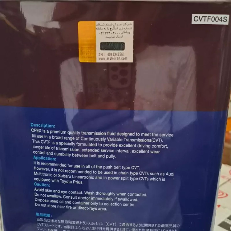 مشخصات روغن گیربکس اتوماتیک (CFEX) خواص ضد اصطکاک و ضد ساییدگی عالی پایداری برش برش عالی و در نتیجه کاهش افت ویسکوزیته روغن سازگاری سیال با انواع قطعات اب بندی تعویض اسان و بدون لرزش دنده سازگار با انواع گیربکس های چند منظوره CVT روغن گیربکس اتوماتیک تمام سنتزی برای طیف گسترده ای از جعبه دنده های متغیر پیوسته CVT که سازگاری کامل با خودرو های تویوتا ، نیسان ،میتوبیشی ، مزدا ، سوزوکی ، سوبارو ، لیفان ، جک ، جیلی و چری دارد.