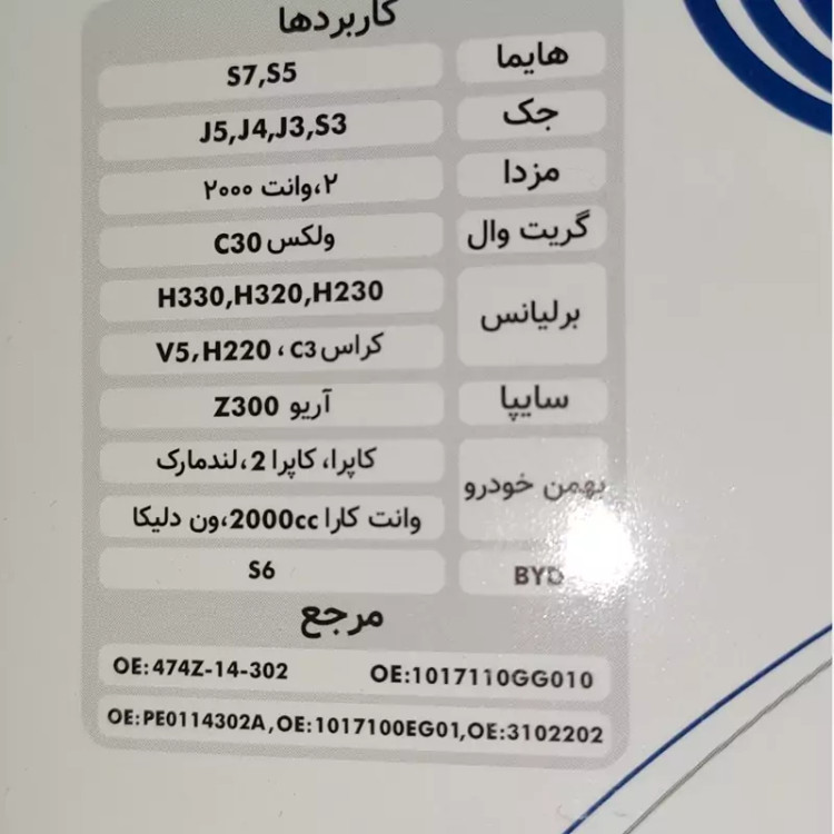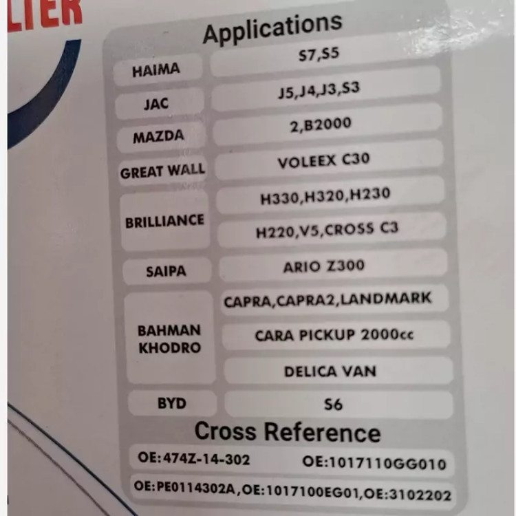 برلیانس - BRILLIANCE 1500CC H320 1500CC H330 1500CC C3 کراس H220 H230 V5 1650CC H320 1650CC H330 1650CC C3 کراس _______________________ بهمن موتور - BAHMAN MOTOR کاپرا کاپرا 2 لند مارک کارا 2000CC ____________________ بی وای دی - BYD S6 ______________________ جک - JAC J4 J3 S3 J5 J5 1500CC ________________ زوتی - ZOTYE Z300 1500CC Z300 1600CC ___________ گریت وال - GREAT WALL ولکس C30 ____________ مزدا - MAZDA B2000 انژکتور B2000 کاربراتور مزدا 2 - DH/DE _________ هایما - HAIMA S5 S7 S7 توربو