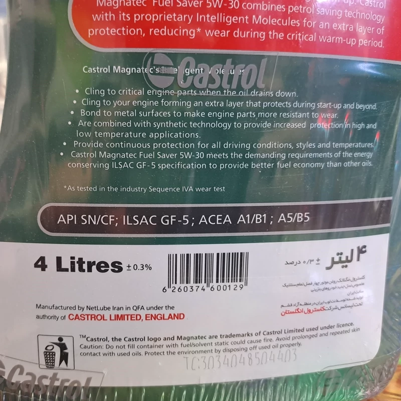 ویژگی های ممتاز روغن موتور کاسترول مدل مگنتیک(5w-30) کاسترول به عنوان یکی از شرکت های پیشرو در صنعت تولید روغن های روان کننده در سطح جهانی محسوب می شود. سطح کیفی SN و درجه گرانروی 5W-30 از مشخصه های بارز این روغن می باشد. در ویژگی های این محصول یکی از نکات مهم که قابل ذکر است مغناطیسی بودن این محصول می باشد به این صورت که مولکول های مغناطیسی هوشمندی که در ساختار آن وجود دارد به قطعات داخلی موتور میچسبد و سبب محافظت قطعات در مقابل خوردگی می شود. ویژگی بعدی و مهم این محصول فوق العاده خاصیت چسبندگی فوق العاده این روغن موتور می باشد که باعث استارت سریع و آسان خودرو می باشد و بهره گیری این روغن از تکنولوژی سنتتیک از نکات قابل توجه در ساخت آن می باشد و همچنین : -استارت سریع و آسان -محافظت از قطعات در مقابل خوردگی -چسبندگی فوق العاده به قطعات حساحس داخل موتور -کمک به استارت سریع و راحتر -کاهش مصرف سوخت -کاهش سایش قطعات روغن موتور کاسترول برای چه خودرو هایی مناسب می باشد: مزدا323 کیا ریو LS رنو ال 90 پژو207 گیربکس اتومات پژو 405 اس ال ایکس تیبا، ساینا، لیفان 520 سمند ای اف سون سورن ای ال ایکس پژو 206 همه مدل ها ویژگی ها: دارای سطح کیفی SM و گرانروی 5W30 تکنولوژی تمام سنتتیک ( Fully synthetic ) تاییدیه استاندارد از خودرو سازی های معتبر ساخت ایران تحت لیسانس کاسترول